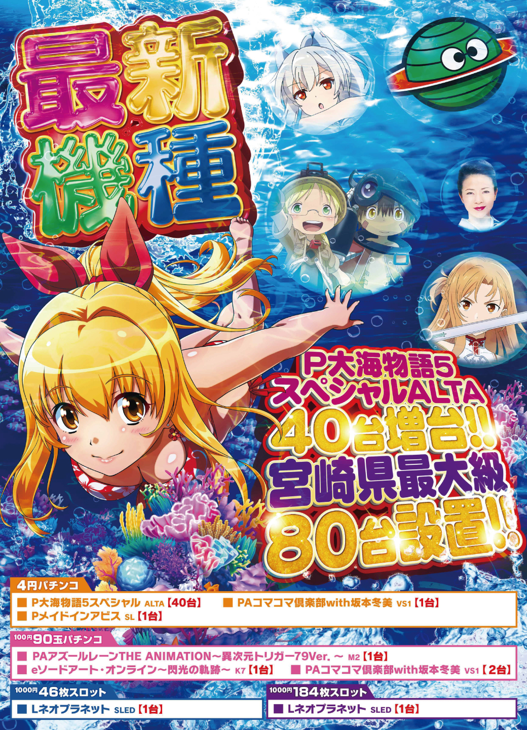 ★☆最新導入機種☆★ ぱちんこP大海物語5スペシャルALTAPAコマコマ俱楽部with坂本冬美VS1PメイドインアビスSLPAアズールレーンTHE ANIMATION~異次元トリガー79Ver.~M2eソードアート・オンライン~閃光の軌跡~K7スロットスマスロネオプラネットSLED