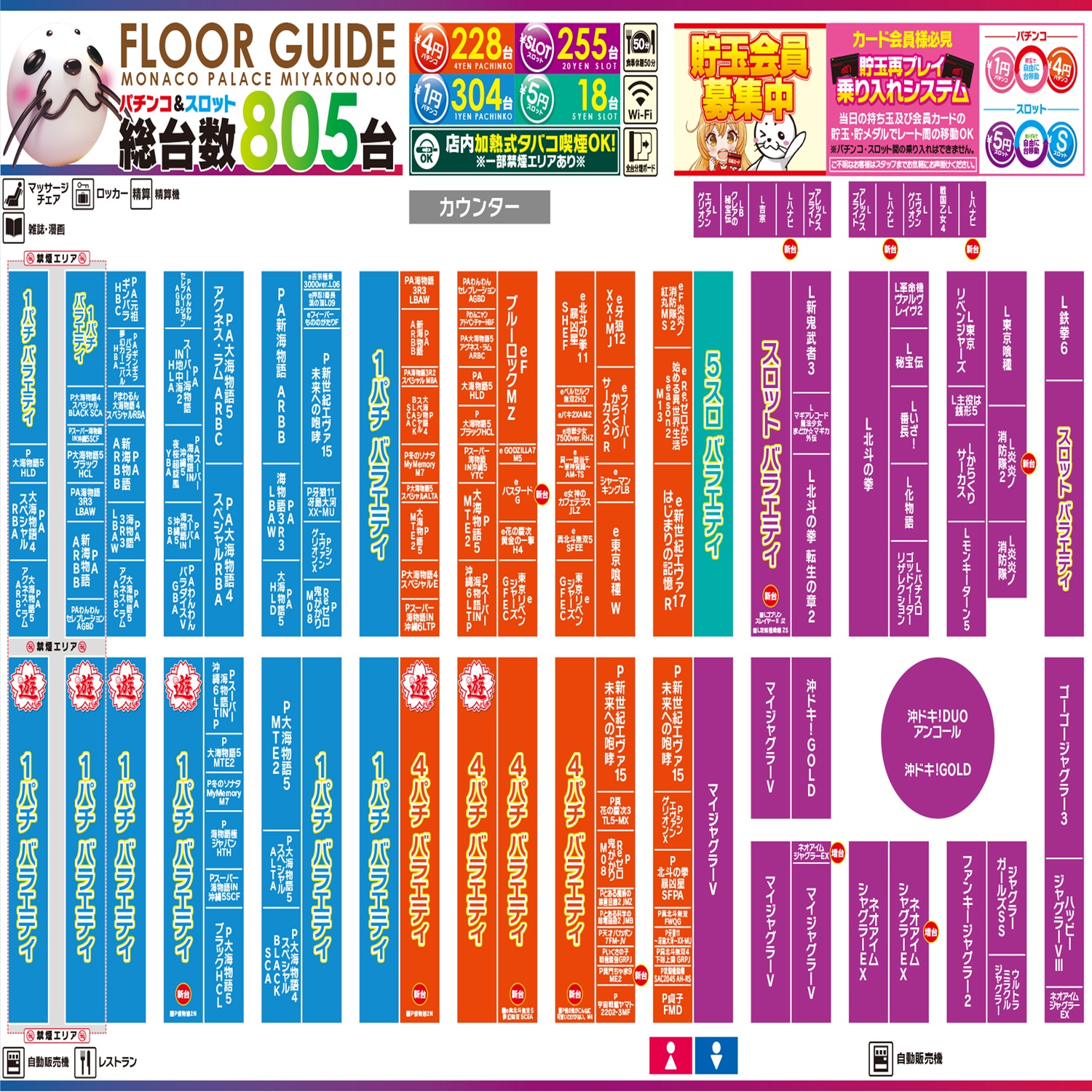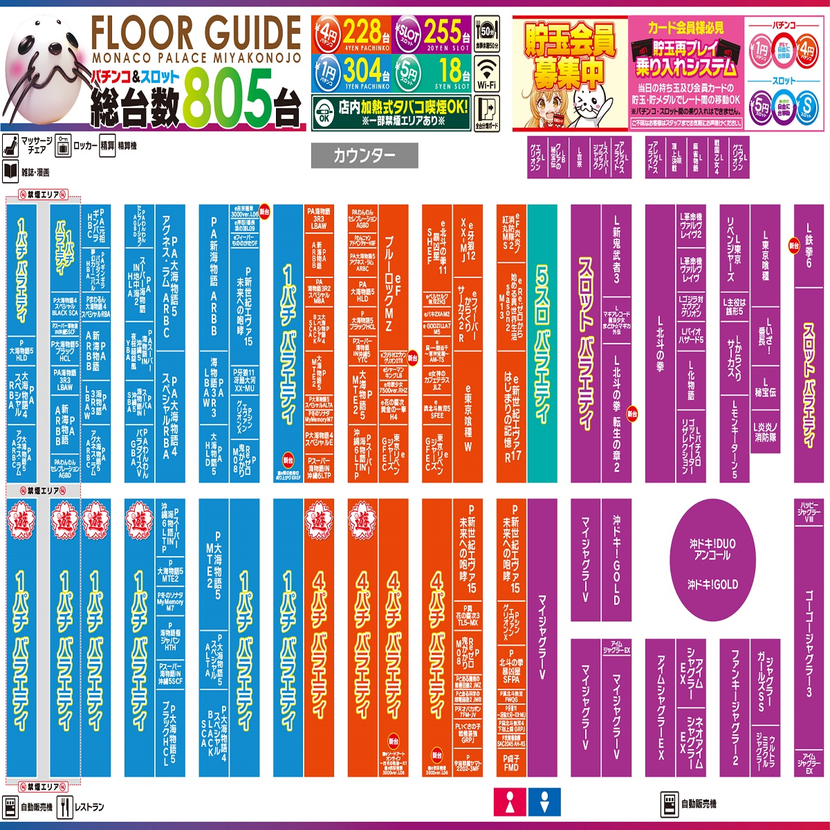 熊本県および宮崎県にてパチンコ遊技場「モナコパレス」「銀馬車」を運営しております。全23店舗、皆様のご来店をお待ちしております